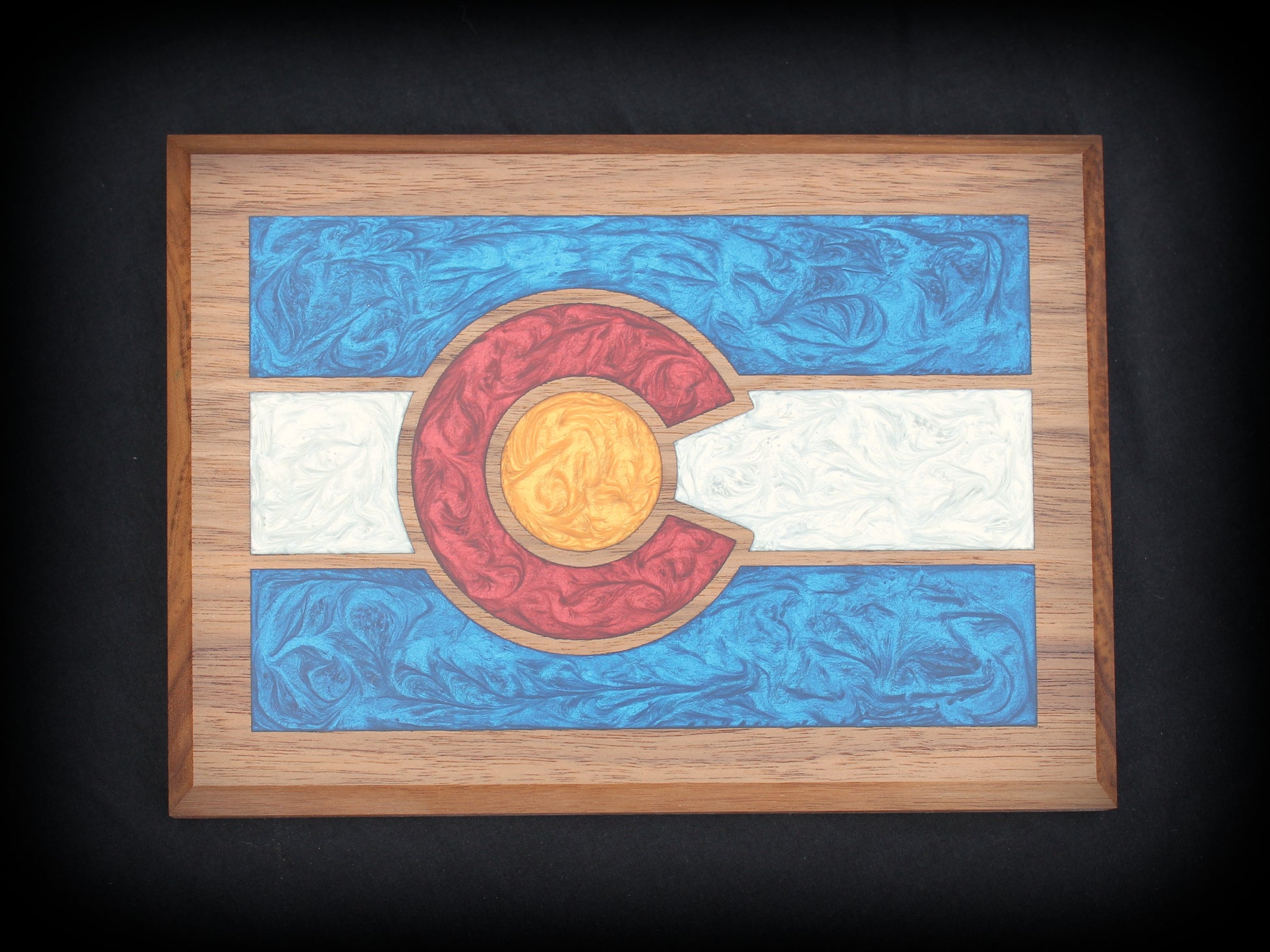 This handmade Colorado flag wall art piece is made from solid American Black Walnut engraved with the flag design, and finished in a stunning pearlescent colored resin infill. Each piece is oiled and finished in a protective matte wax layer for a smooth and beautiful finish. Each piece is 8.3125" wide X 6" tall X 0.75" thick, and contains a single keyhole on the back for easy wall hanging with a single screw or nail. Average weight of 1lb.
