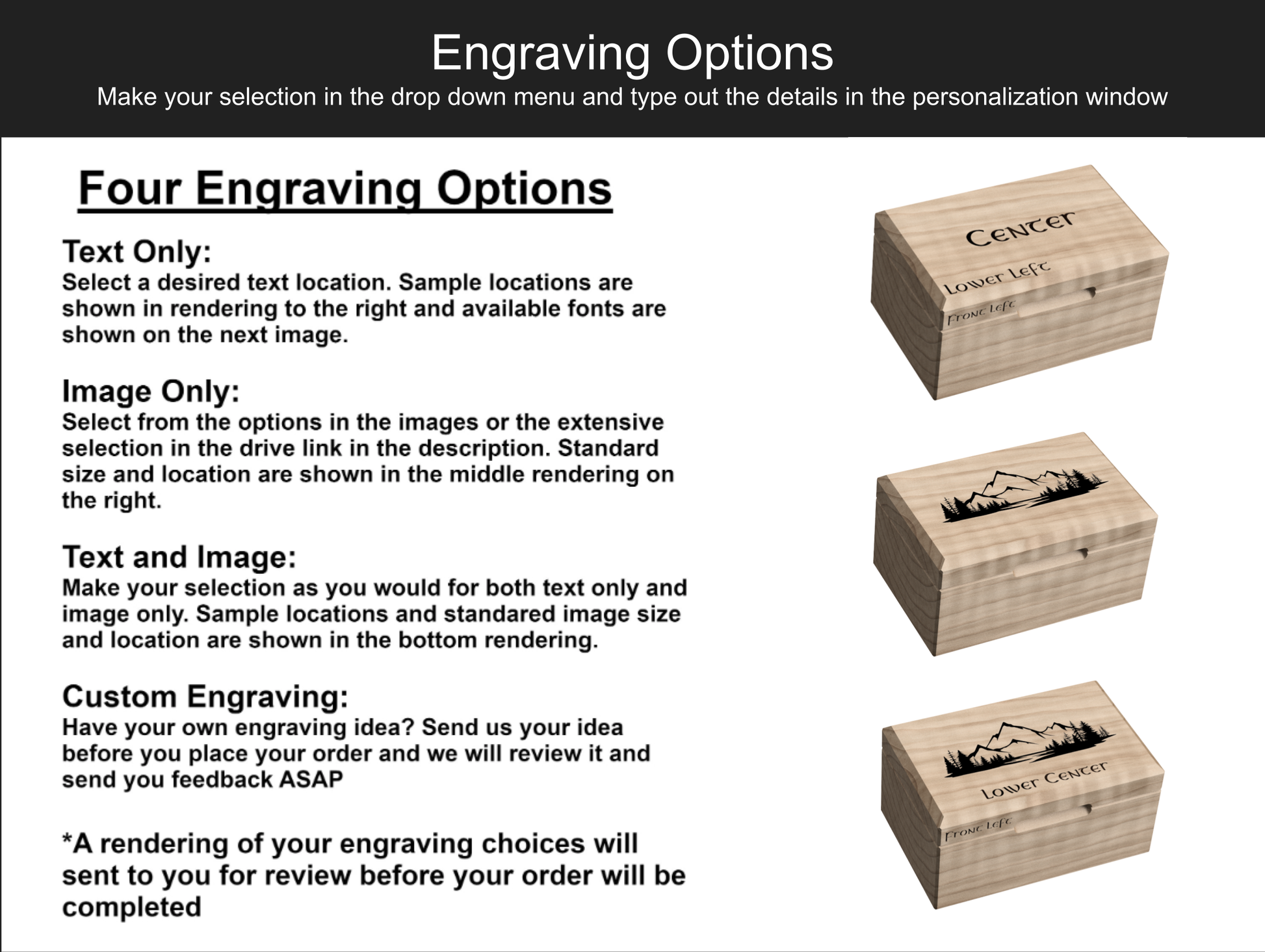 Text: One line of Text in your desired font and location on the exterior of the box. You may choose between one of the eight fonts in the pictures above.