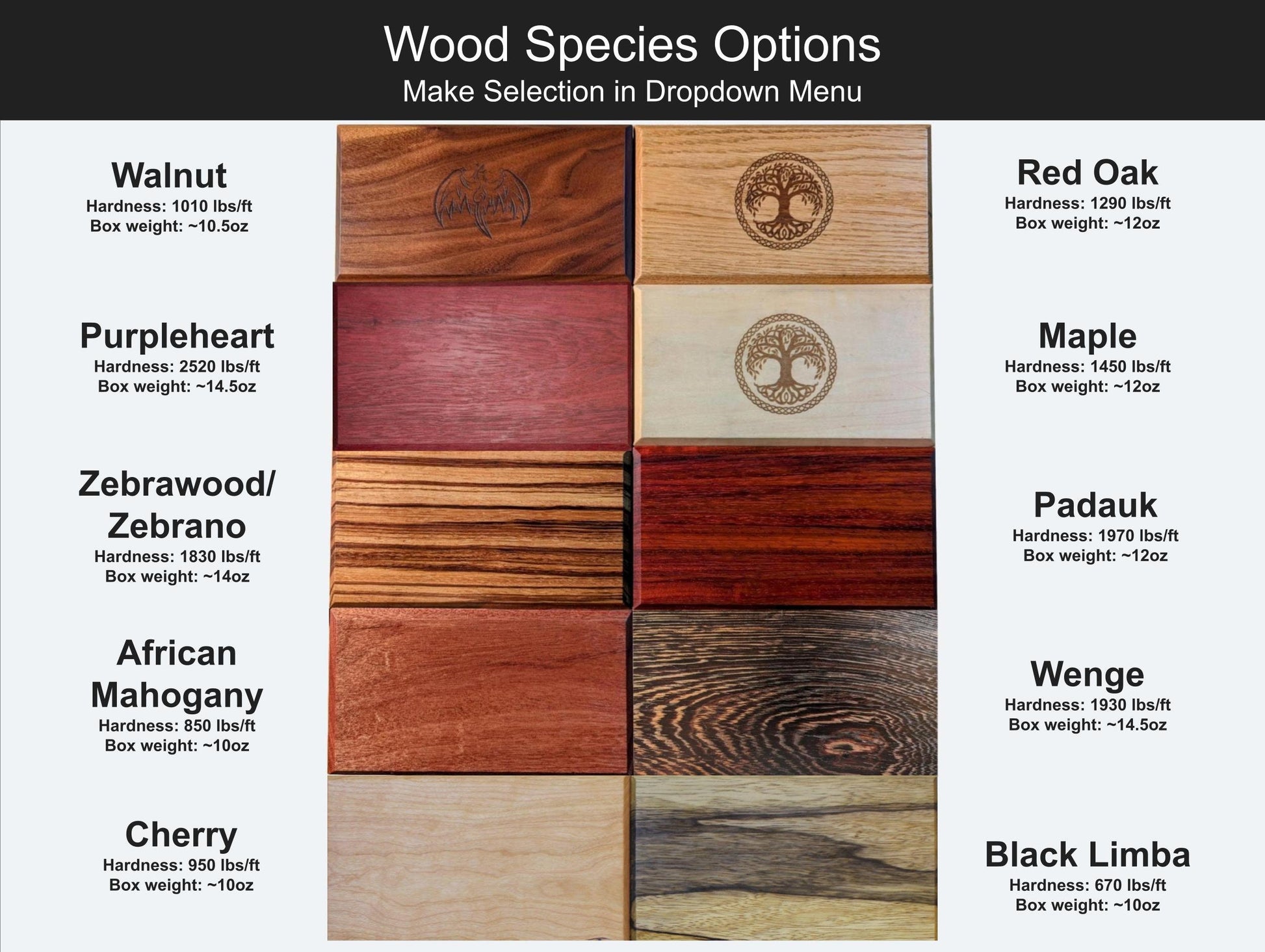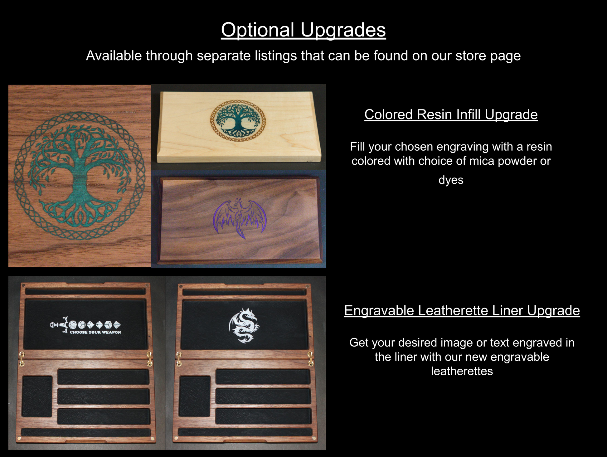 Handmade from premium hand selected hardwoods, lined with your choice of felt or faux leather, and laser engraved with your choice of image and/or text.