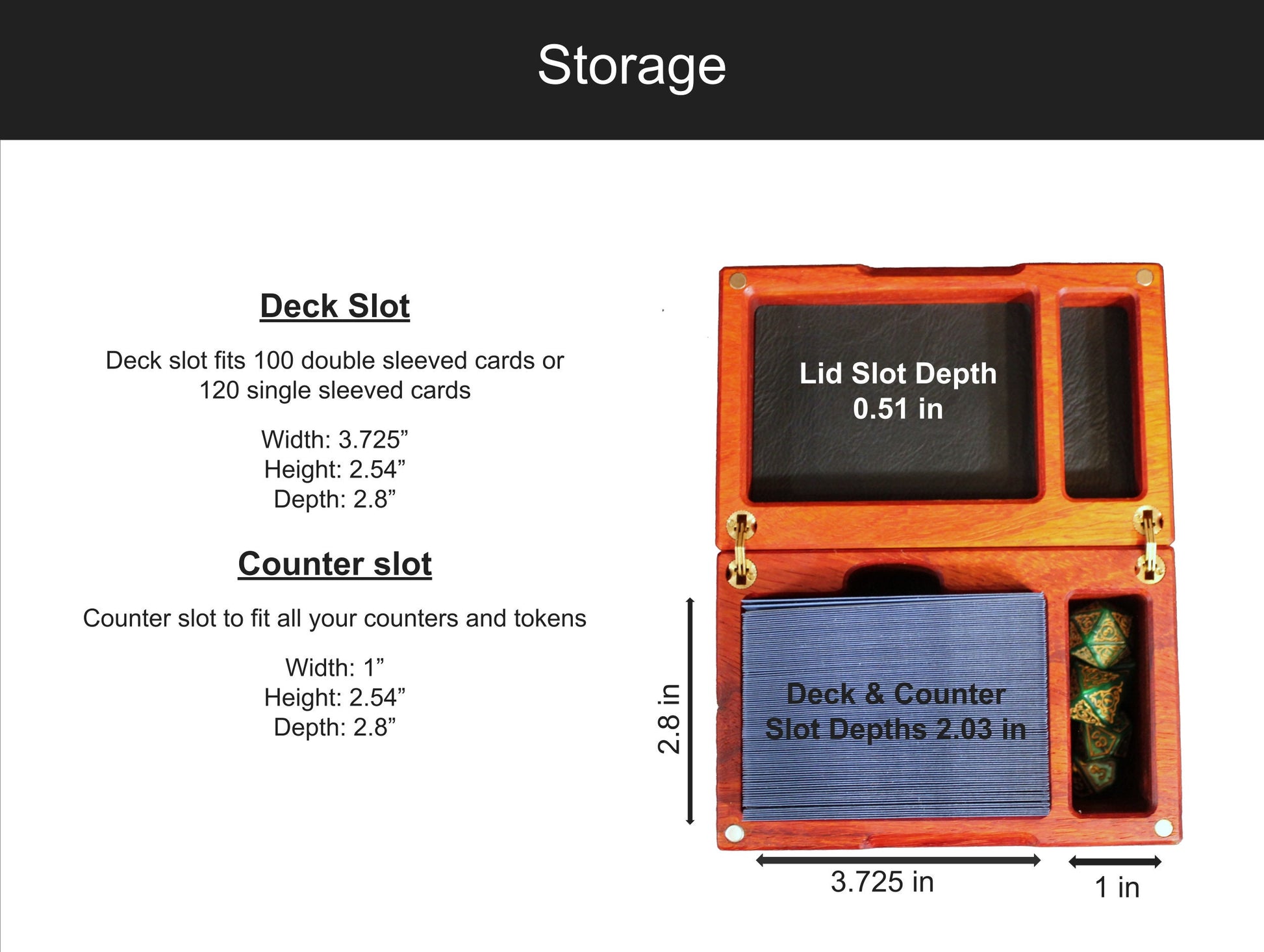 Includes 4 card slots that are compatible with both single and double sleeved decks. Slots is 3.725" long, 2.03" deep, and 2.725" wide. Slots allow for up to 120 single sleeved cards, leaving room for any tokens you may need to carry with your deck.